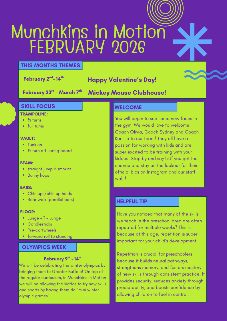 Beginning in January, we're excited to offer makeup classes to give families more flexibility! How it works: Students will begin earning Makeup Tokens when we return from break on January 2, 2026. Each student will earn 1 makeup token per calendar month. Tokens are valid for 45 days from the date of your student's absence. Tokens will automatically generate the day after your students absence, and subsequentially expire on the expire after 45 days. Starting January 10, makeup classes will be held on Saturdays between 1:30–4:30 PM. Registration is required and first come, first served. There are no walk-ins for makeup classes. To secure a spot, please contact Client Services at 716-639-0020 or info@greaterbuffalogymnastics.com Cancellation Policy: Need to cancel? No problem! If you contact us at least 1 hour before class, we will cancel your makeup class and return your token, so it isn’t lost. If a student is a no call / no show, the makeup token will be forfeited. We hope this added flexibility helps your family stay on track and continue enjoying classes with us! Let us know if you have any questions. Classes Eligible for Makeups: Junior Jumpers Kinder Kids Leaping Learners Beginner Intermediate Advanced Beginner Advanced Hot Shots 1 Hot Shots 2